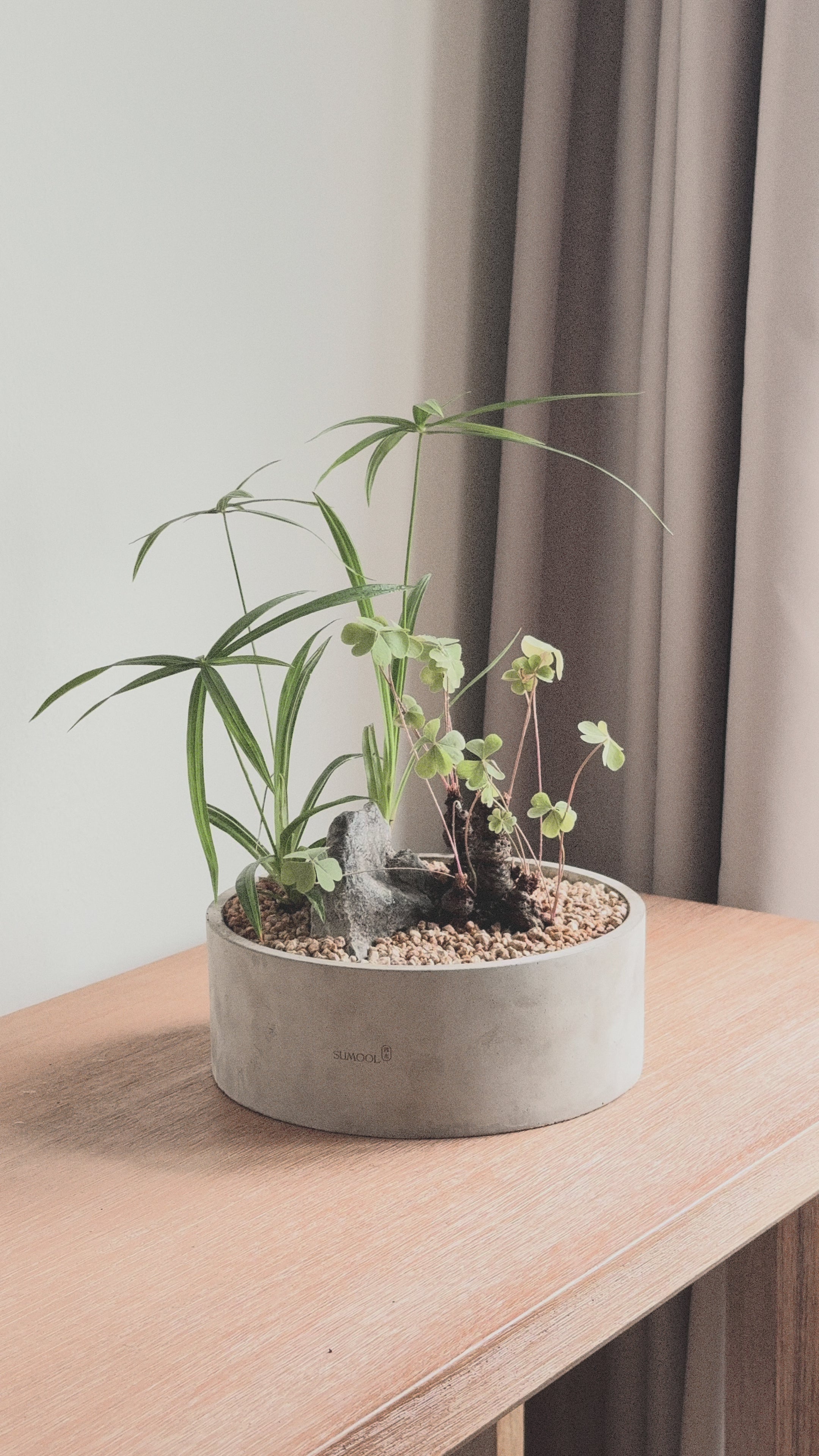 This mini landscape brings together soft, tiny clovers and a gentle umbrella-like Cyperus to create a calm, natural meadow in one pot. The clover stands like a little bonsai with round leaves dancing above its chubby base, while the Cyperus rises gently beside it like a tiny forest canopy — giving a peaceful, storybook feeling.